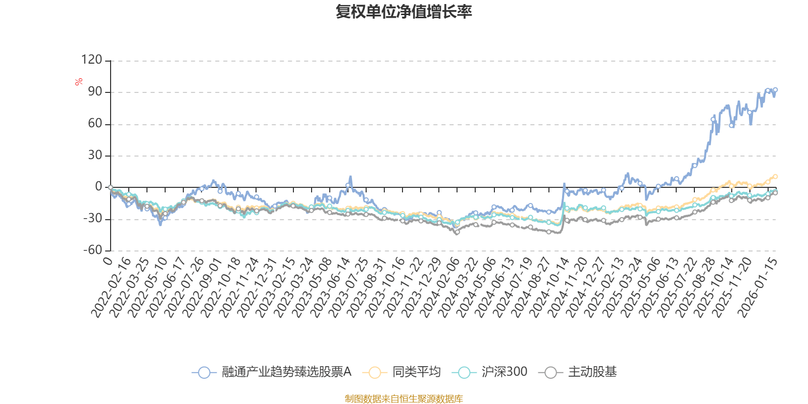 截至1月15日,融通产业趋势臻选股票A近三个月复权单位净值增长率为18.42%,位于同类可比基金1/58;近半年复权单位净值增长率为63.29%,位于同类可比基金1/58;近一年复权单位净值增长率为111.64%,位于同类可比基金1/57;近三年复权单位净值增长率为125.90%,位于同类可比基金2/57。
