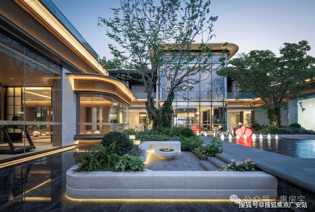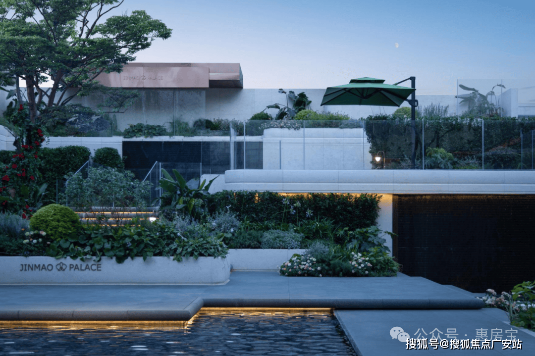 蓝翡翠水景围着下沉庭院,中间有蜿蜒的挑台连着瀑布,顶层还有供业主小聚的女王花厅,