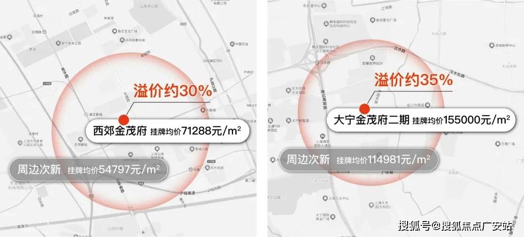 大宁金茂府二期挂牌约15.5万/㎡,周边次新整体挂牌约11.5万/㎡,金茂府有约35%溢价;