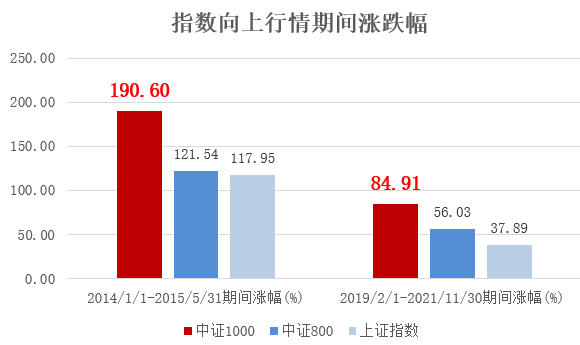 由于成分股中小市值风格鲜明,因此中证1000指数通常对盈利改善、资金流入和市场情绪变化的反应更为敏感,在市场回暖上涨、风险偏好提升的向上行情中,也呈现高弹性特征。Wind数据统计,在2014-2015年的普涨行情、2019-2021年的结构性行情中,中证1000在上涨期间的表现大幅跑赢了中证800、上证指数等核心宽基。