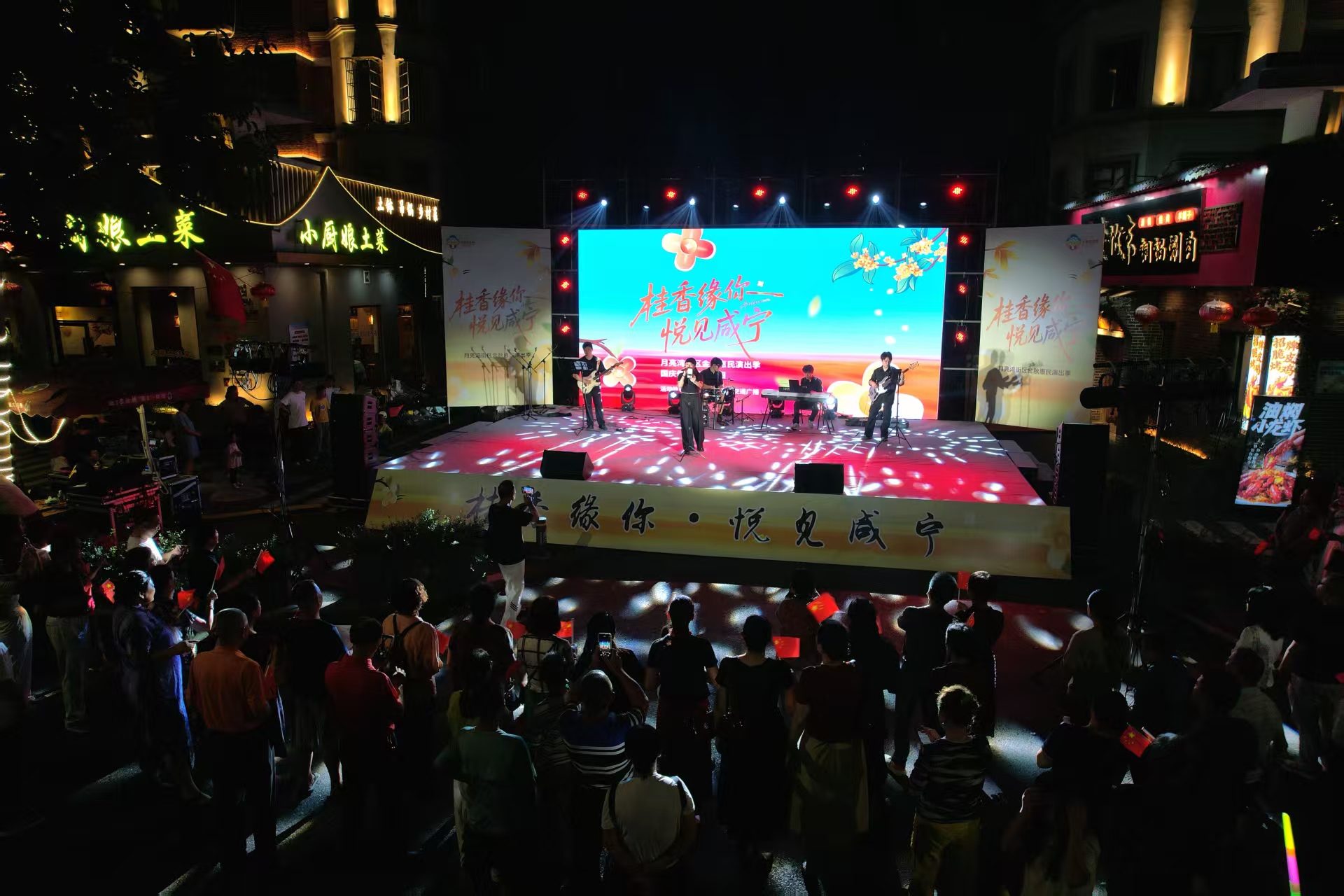 双节期间,咸宁市围绕“桂香缘你·悦见咸宁”金秋旅游季主题,推出了一系列丰富多彩的活动。月亮湾音乐节三天吸引超10万人次游客。10月5日晚,拥有4600多万粉丝的抖音头部音乐人唐艺带领团队以“桂香缘你·悦见咸宁”为主题,带来“视听+带货”双模式演出,同步开启咸宁优品直播带货和户外演唱直播,吸引近10万观众现场参与,50余万网友同步在线万余名省外游客到咸宁休闲度假、品桂闻香、尽享美食。